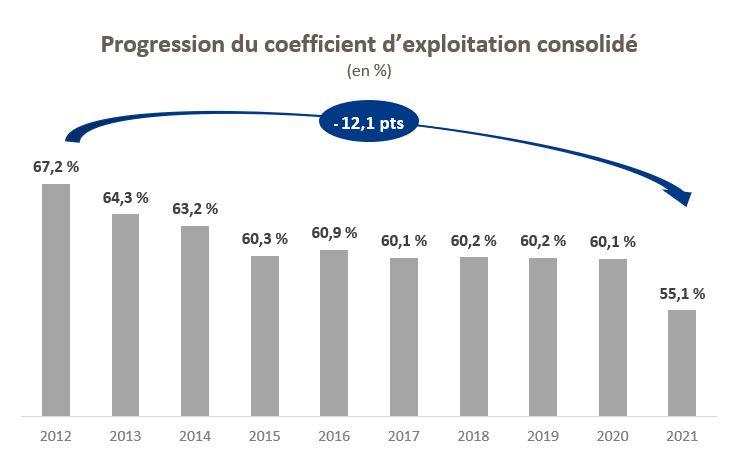 En baisse de plus de 12 points depuis 2012, le coefficient d’exploitation s’établit à 55,1 % (sur résultat comptable et 55,2 % hors éléments exceptionnels), un excellent niveau dans le secteur bancaire français.
