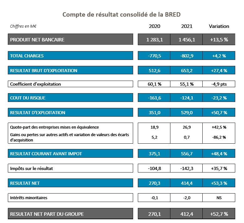 En 2021, la BRED a réalisé un PNB consolidé de 1,46 milliard d’euros (+ 13,5 %) et son résultat net s’établit à 412 millions d’euros, en progression de 52,7 %.
