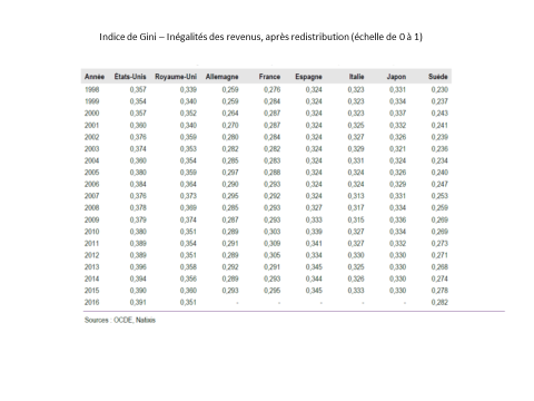 La France en 2015 est à 0,295, parmi les indices les plus bas de tous les pays pris en compte. On passe donc d’un indice parmi les plus élevés en termes d’inégalité avant redistribution à un indice parmi les plus bas après redistribution. Ainsi donc en France, la redistribution est-elle très forte. Aux États-Unis, le niveau des inégalités après redistribution est beaucoup plus élevé qu’en France. Mais en Espagne, en Italie, en Allemagne, le niveau d’inégalité des revenus après redistribution est à peu près identique à celui la France. Et l’on se retrouve à des niveaux, toujours après redistribution, assez comparables à ceux de la Suède.